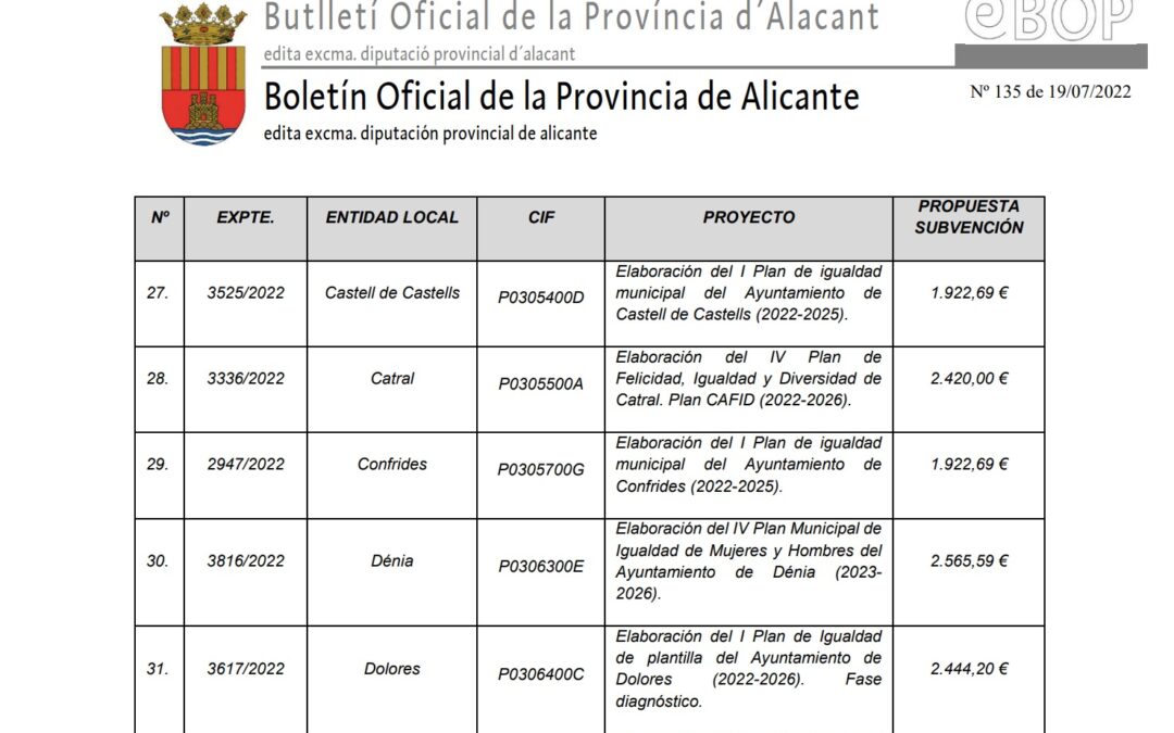La Excma. Diputación Provincial de Alicante, mediante Acuerdo Plenario de fecha 20 de julio de 2022, aprobó la Concesión de Subvenciones de Infraestructuras y Asistencia a Municipios: Plan +CERCA 2022. Línea de actuación gastos corrientes del Área de Asistencia a...