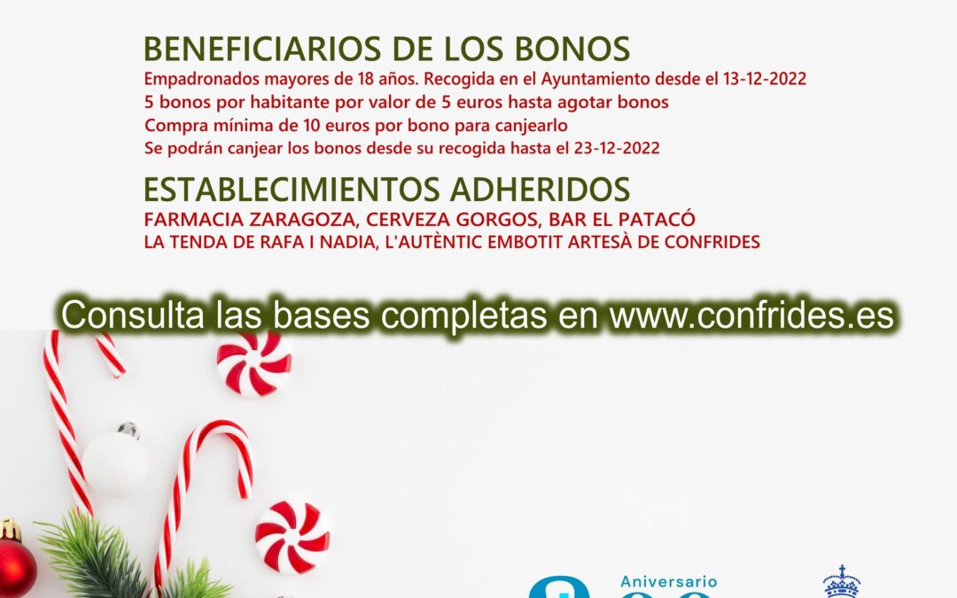 BONO CONSUMO NAVIDAD Confrides / L’Abdet La campaña, financiada al 100% por la Diputación de Alicante con una inversión de 6735,00 euros, tiene por objeto el apoyo al comercio local e impulsar el consumo en los establecimientos de Confrides y L’Abdet. BENEFICIARIOS: ...