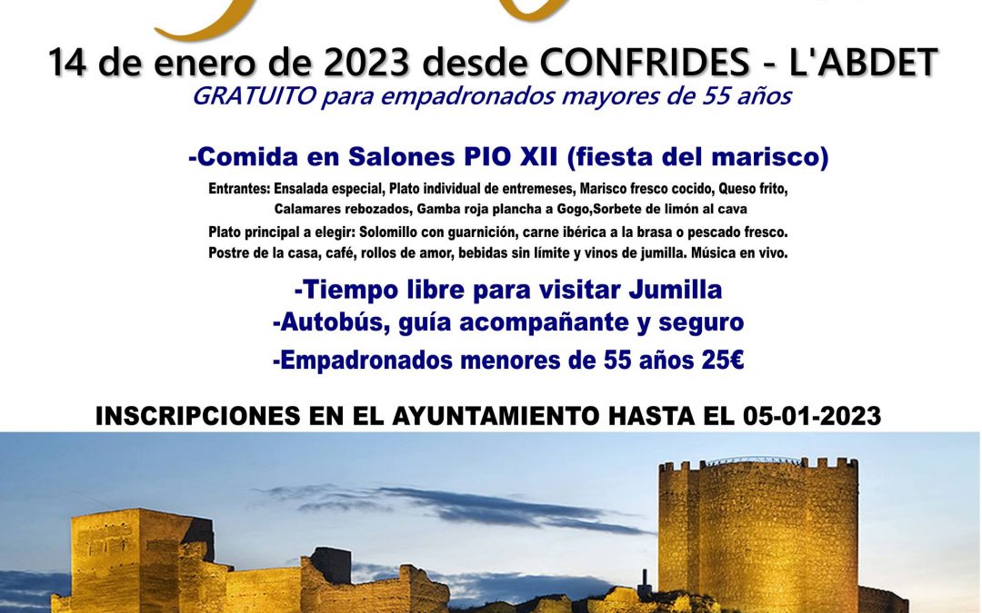 Viaje a Jumilla para empadronados en Confrides – L’Abdet. El Ayuntamiento de Condrides L’Abdet ha organizado un viaje a Jumilla que tendrá lugar el 14 de enero de 2023. El viaje es gratuito para empadronados mayores de 55 años y los asistentes...