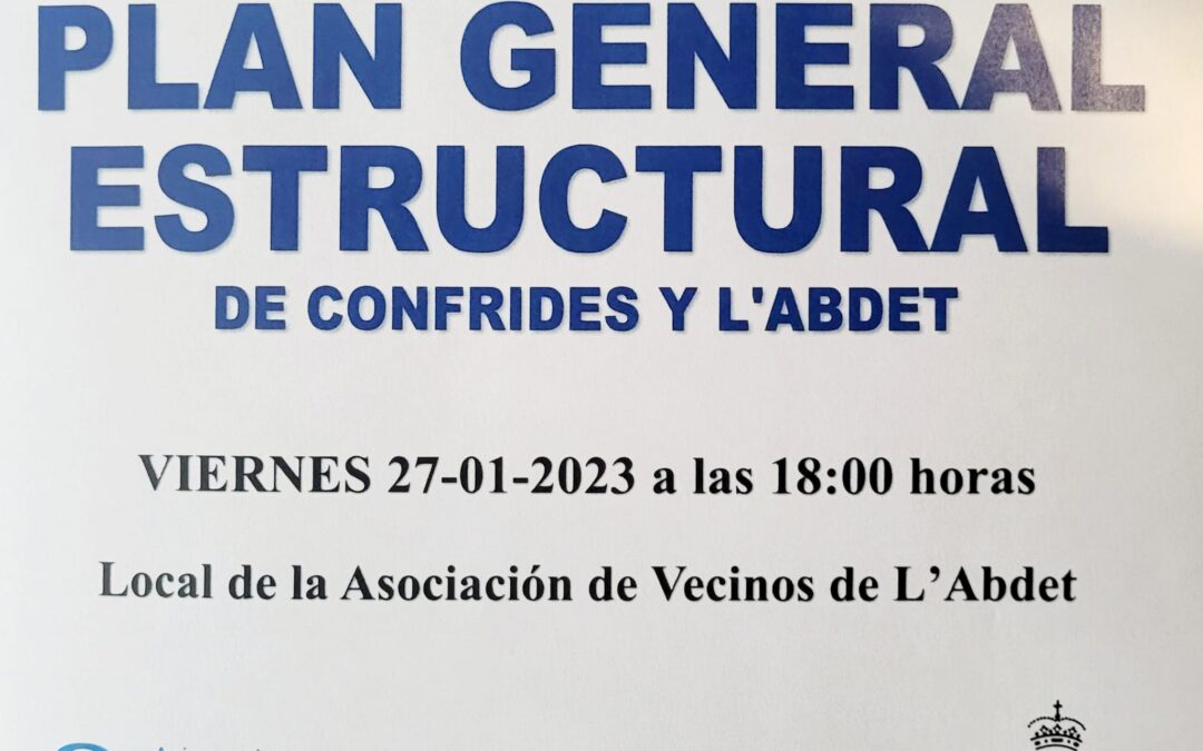El viernes 27 de enero a las 18h. tendrá lugar en el local de la ASOCIACIÓN DE VECINOS DE L’ABDET la 2ª reunión informativa del PLAN GENERAL ESTRUCTURAL de #ConfridesLAbdet. Desde el Ayuntamiento se hace un llamamiento a todos los vecinos y vecinas de Confrides...