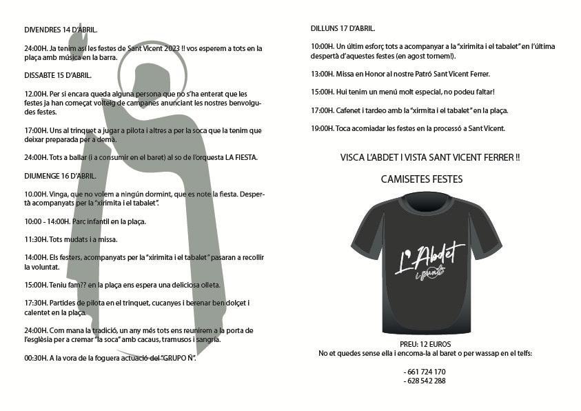 Llegan las esperadas fiestas de L’Abdet. Del 14 al 17 de abril celebramos nuestras queridas fiestas de Santa Vicent de L’Abdet. Desde el Ayuntamiento os deseamos a todos los vecinos y visitantes unas muy felices fiestas.
