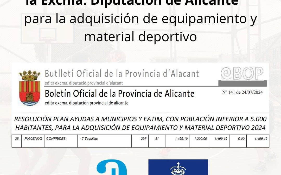 La Diputación Provincial de Alicante ha concedido al Ayuntamiento de Confrides una subvención, por importe de 1.499,19 €, para la adquisición de equipamiento y material deportivo, dentro de la Convocatoria del Plan de ayudas a municipios y Entidades de Ámbito...