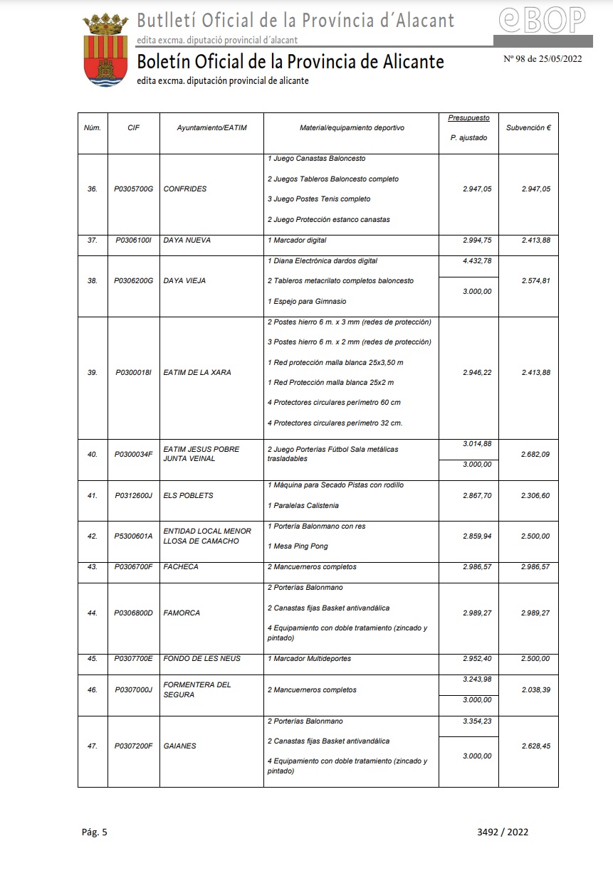 La Diputación de Alicante ha concedido a Confrides/L’Abdet la cantidad de 2.947,05€ de la subvención de «PLAN DE AYUDAS A MUNICIPIOS DE LA PROVINCIA DE ALICANTE MENORES DE 5000 HAB., PARA LA ADQUISICIÓN DE EQUIPAMIENTO Y MATERIAL DEPORTIVO, ANUALIDAD 2022»