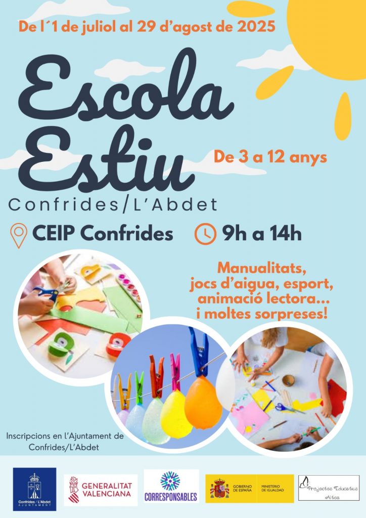 Las inscripciones para la esperada Escuela de Verano Confrides / L’Abdet 2025 ya están abiertas, ofreciendo a los niños y niñas de 3 a 12 años la oportunidad de disfrutar de diversas actividades lúdicas y educativas durante los meses de julio y agosto. Esta actividad se llevará a cabo desde el 1 de julio hasta al 29 de agosto, en horario de 9:00 a 14:00 horas.