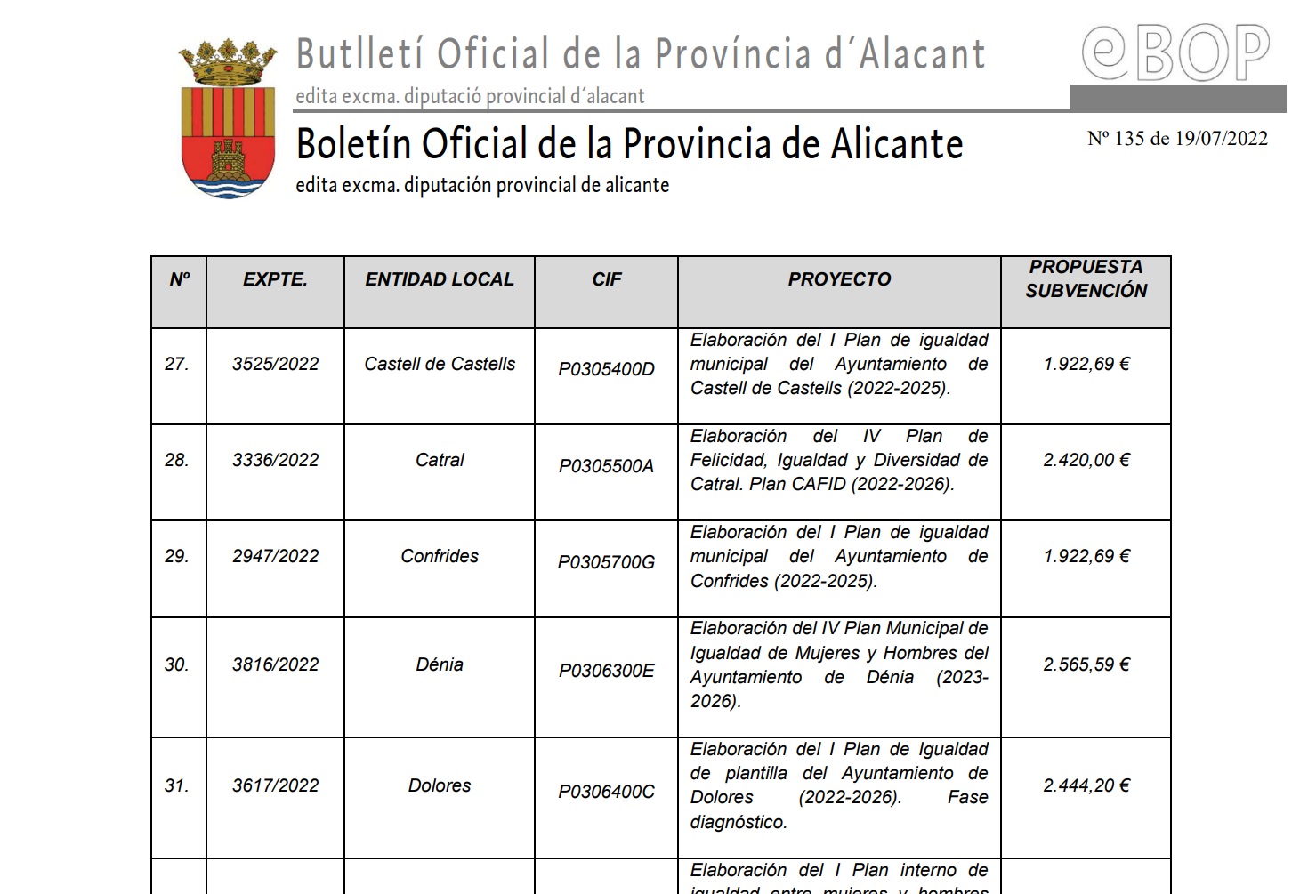 La Junta de Gobierno de la Excma. Diputación Provincial de Alicante, en sesión ordinaria de fecha 11 de julio de 2022, en virtud de la delegación efectuada por Decreto del Ilmo. Sr. Presidente número 2019-2946, de fecha 24 de julio de 2019 (B.O.P. núm. 145 de fecha 1 de agosto de 2019) en relación a la distribución de la `Convocatoria de subvenciones a Ayuntamientos y Entidades de ámbito territorial inferior al municipio (E.A.T.I.M.) de la provincia de Alicante para la elaboración y evaluación de planes de igualdad de género, anualidad 2022´, por unanimidad ha acordado conceder al Ayuntamiento de Confrides 1.922,69 euros para la redacción de un Plan de Igualdad.