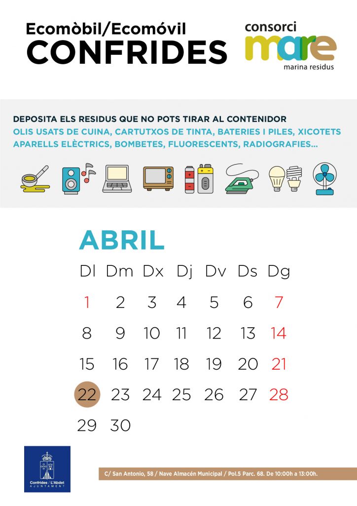 Se informa del servicio extraordinario del ecoparque móvil LUNES 22 DE ABRIL se instalará junto a la NAVE – ALMACÉN MUNICIPAL para recoger todos los residuos que no se pueden tirar en la basura.