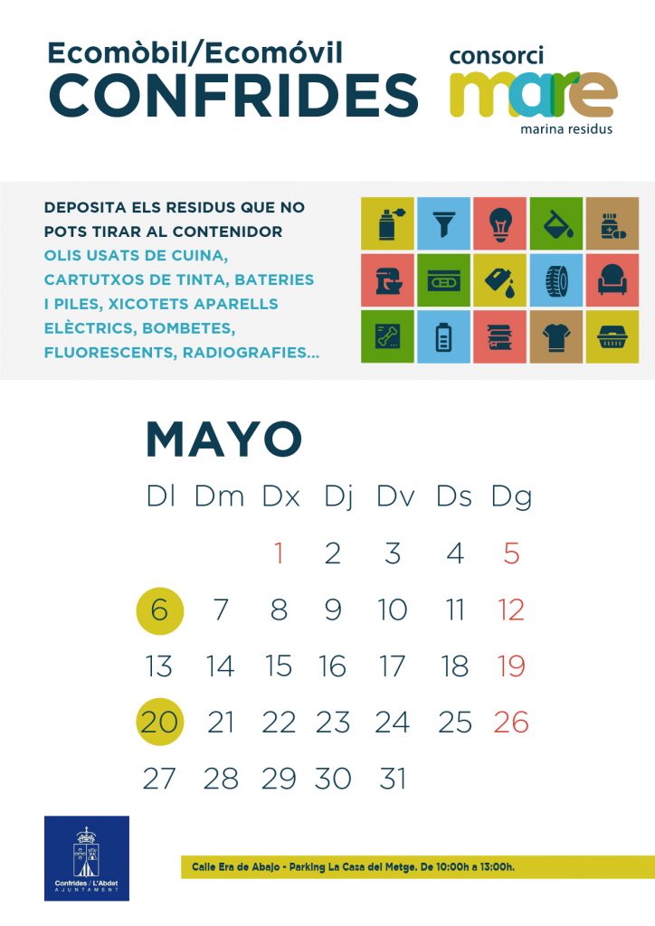 Se informa del servicio extraordinario del ecoparque móvil LUNES 20 DE MAYO se instalará en la calle Era de Abajo-Parking la casa del médico de 10:00h a 13:00h para recoger todos los residuos que no se pueden tirar en la basura.