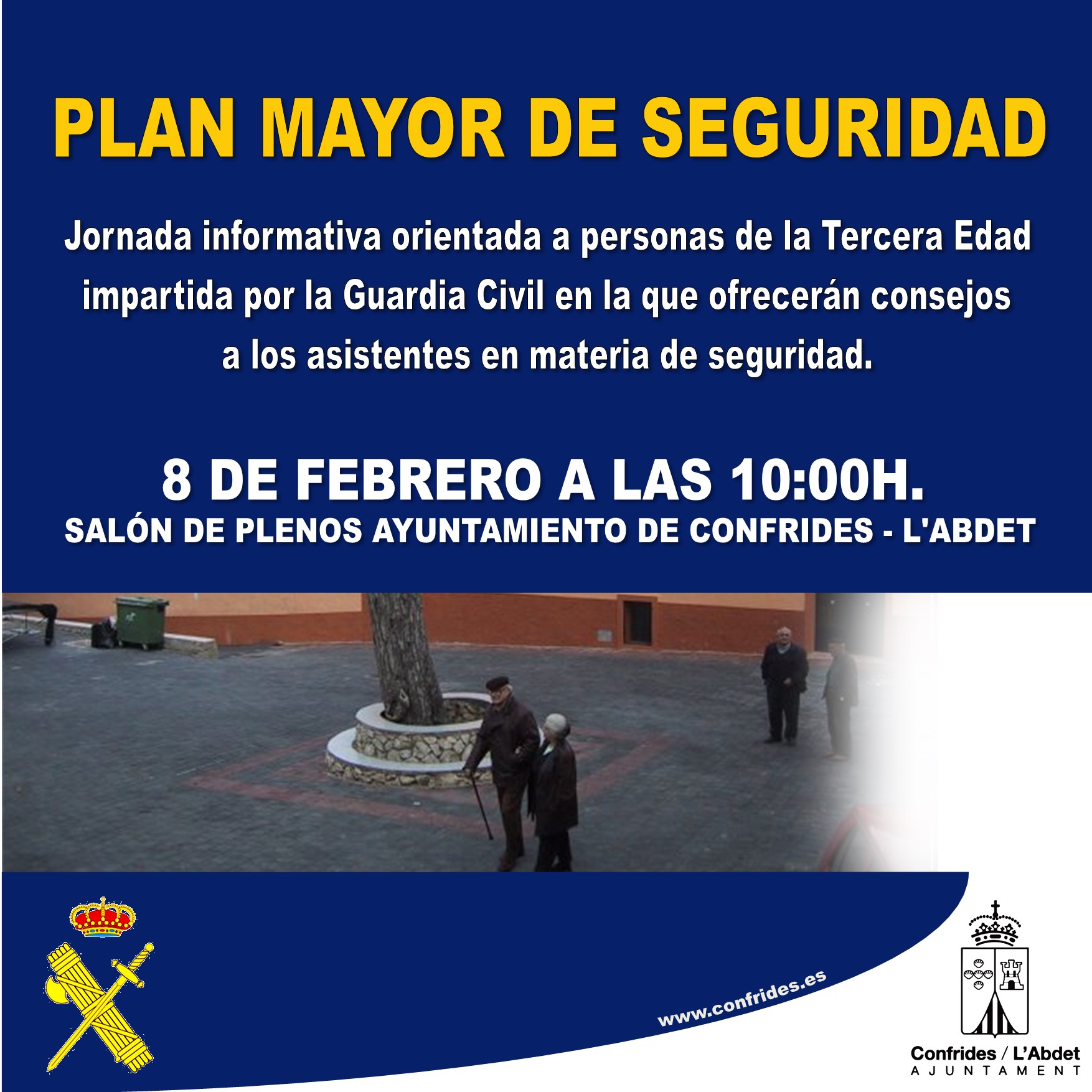 La Guardia Civil impartirá estas jornadas informativas, englobadas en el PLAN MAYOR DE SEGURIDAD, orientadas a personas de la Tercera Edad. En ellas ofrecerán consejos a los asistentes en materia de seguridad ciudadana para prevenirles de posibles fraudes.