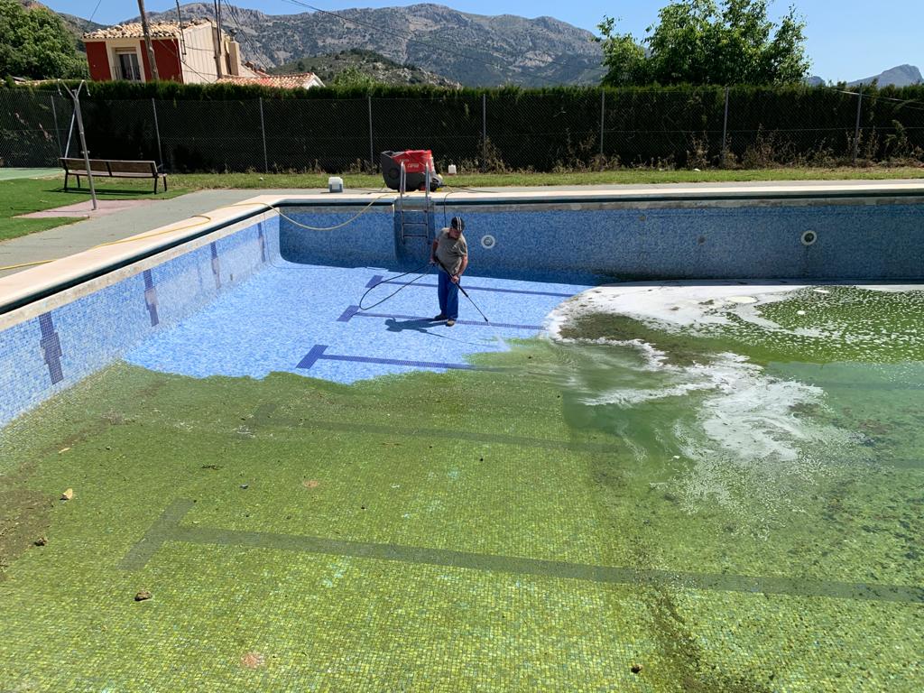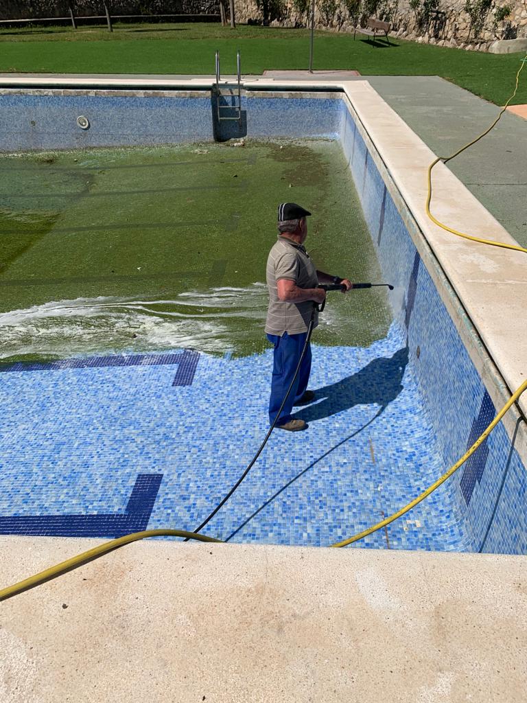 Se está llevando a cabo la limpieza interior de la piscina con una hidrolimpiadora profesional de alta presión para el posterior llenado y puesta en marcha de la depuradora y limpieza de filtros de la bomba. Así mismo, se reparará y pintará la parte inferior de la corona de la piscina que se encuentra un poco deteriorada.