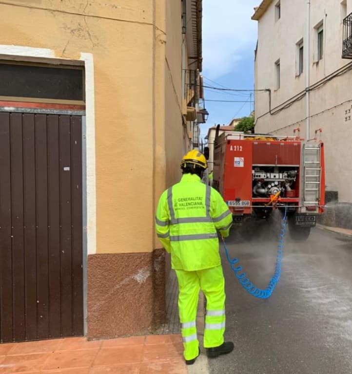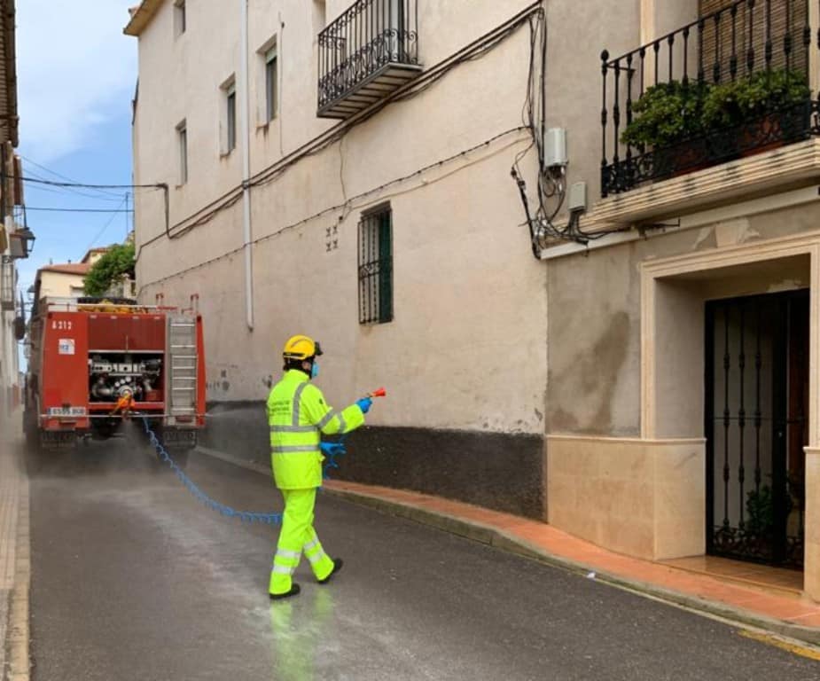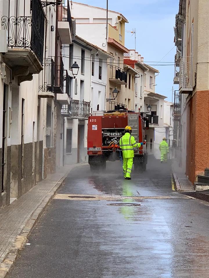 Dos unidades de bomberos forestales de la Generalitat Valenciana de la Unidad Callosa d’en Sarrià con una autobomba y un capataz cordinador estuvieron ayer desinfectando de nuevo las calles principales, plazas y mobiliario urbano de Confrides.