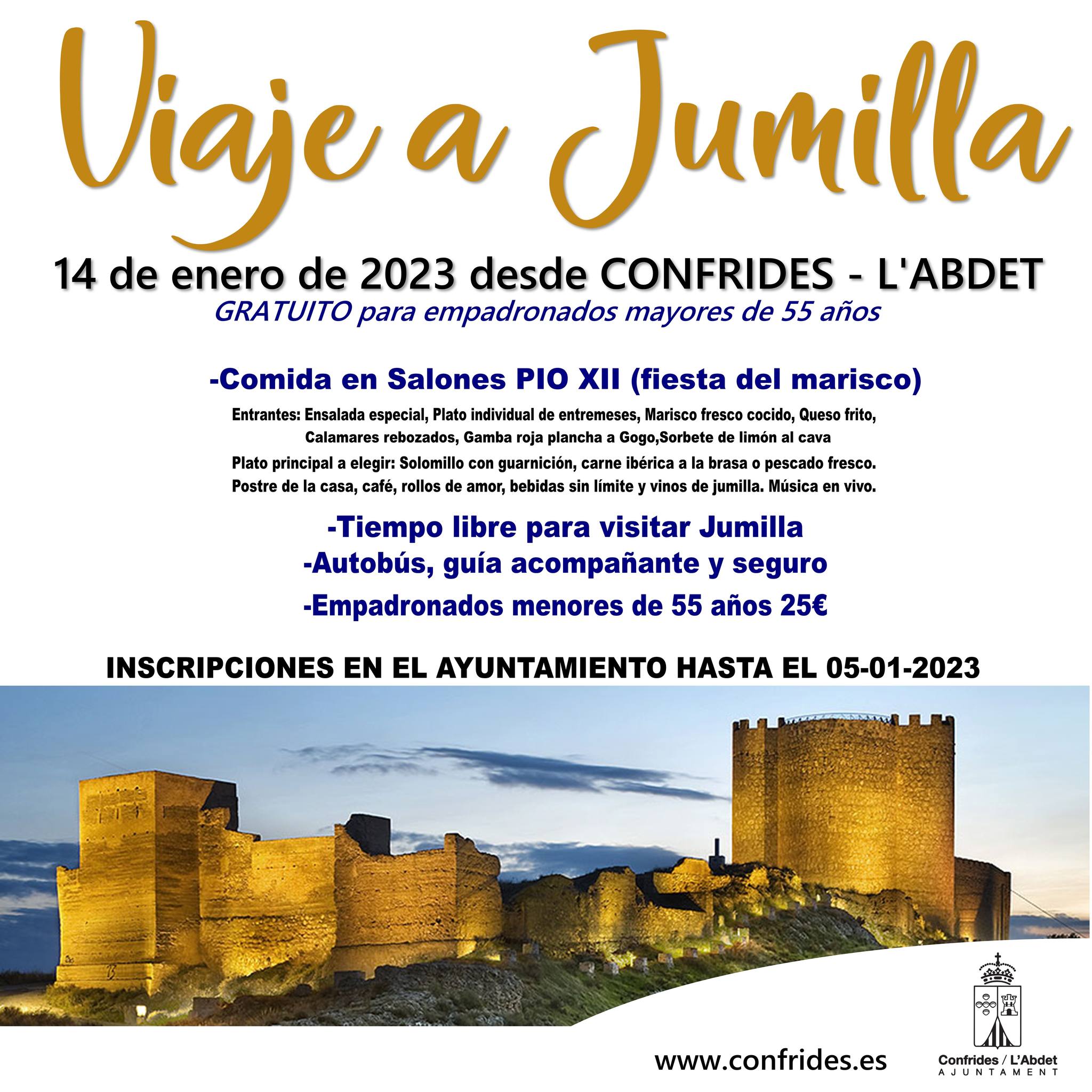 El Ayuntamiento de Condrides L’Abdet ha organizado un viaje a Jumilla que tendrá lugar el 14 de enero de 2023. El viaje es gratuito para empadronados mayores de 55 años y los asistentes disfrutarán de la popular «Fiesta del Marisco» y también dispondrán de tiempo libre para visitar Jumilla.